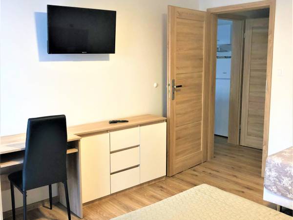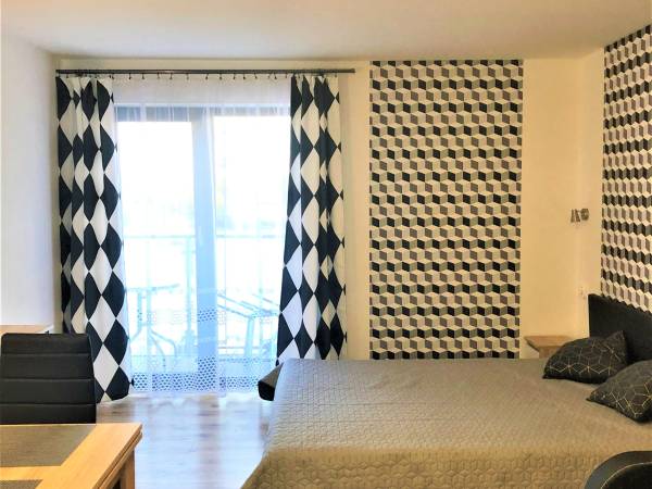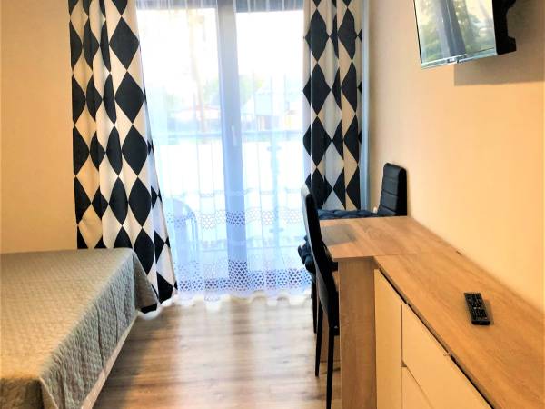 Apartament Mała Frajda: przestronny dwupokojowy apartament z ogromnym słonecznym tarasem i wejściem z ogrodu daje możliwość spędzenia czasu nawet 6 osobom. Duża sypialnia z łóżkiem małżeńskim i łóżkiem jednoosobowym oraz wyjściem na taras. Dodatkowo pokój dzienny z aneksem kuchennym ( lodówka, kuchenka, piekarnik, zestaw zastawy stołowej i garnków oraz urządzeń kuchennych), miejsce do spożywania posiłków oraz podwójne łóżko oraz sofa. Duża łazienka z prysznicem i toaletą.